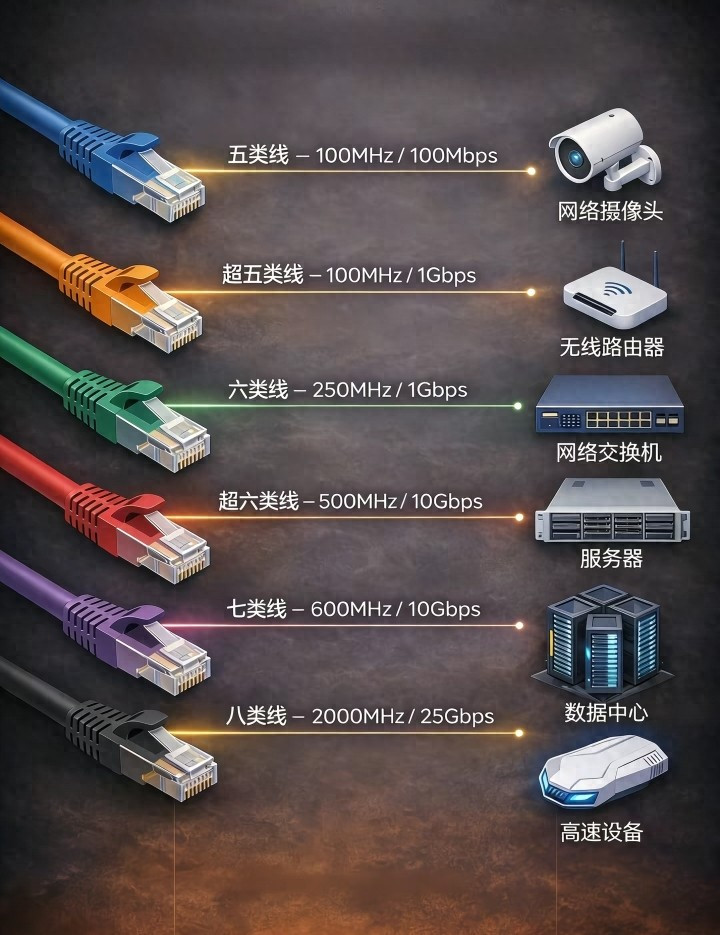 截至2026年4月,网络布线技术已经高度成熟,不同类别的双绞线以太网线在各自的应用场景中发挥着不可替代的作用。从早期广泛使用的五类线到性能强大的八类线,每一种网线都有明确的频率带宽、传输速率以及典型适配设备。了解这些网线的特性,有助于我们合理规划家庭网络、企业局域网以及数据中心的基础设施。本文将以2026年的视角,系统梳理五类线、超五类线、六类线、超六类线、七类线以及八类线的技术参数和实际用途,并分析它们在当前网络环境中的定位。
