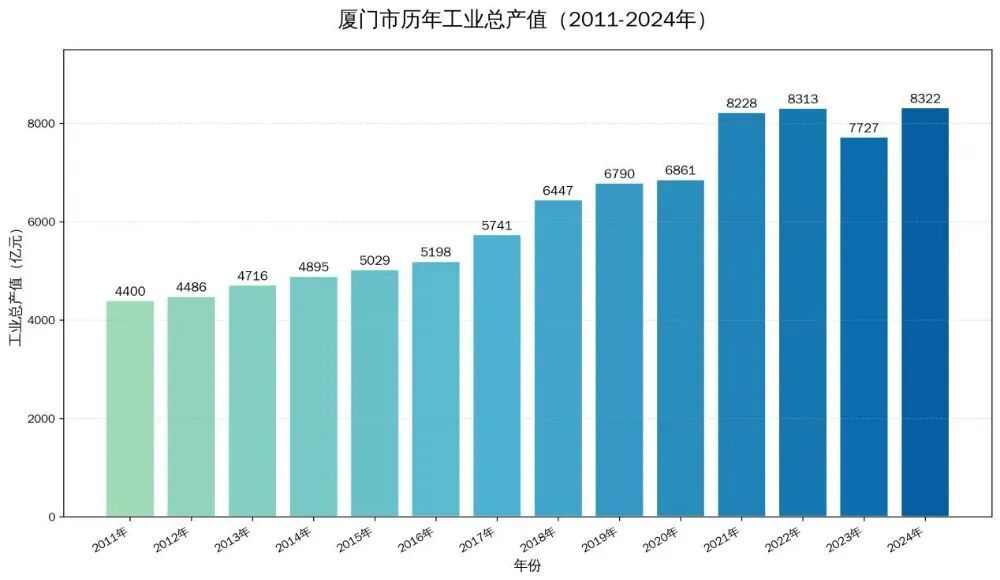 在工业产值上,深圳5万多,苏州将近5万,头部城市2-4万,厦门多少?8000多,最近5年增幅非常慢,原地踏步。