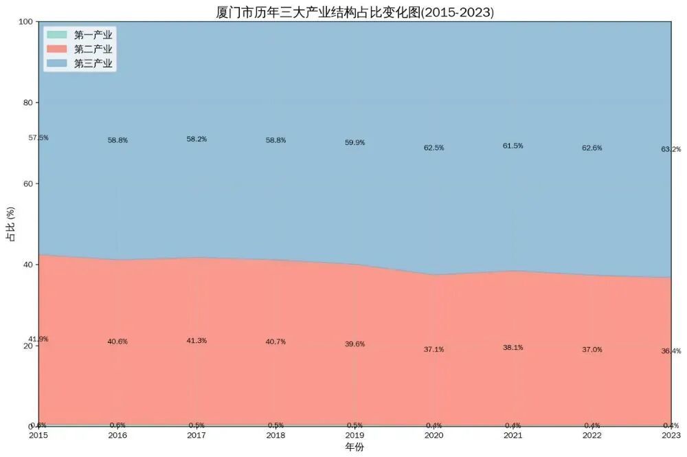 产业结构不均衡,三产太高,二产太低,这就导致了腰部行业和腰部收入不高,跟其他城市比明显没有竞争力,省内干不过福州,5大计划单列市也仅仅比大连强点。